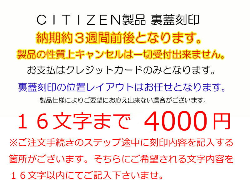 腕時計の裏蓋に文字入れ(刻印 彫刻) CITIZEN シチズン 16文字まで レイアウトお任せ 納期約3週間 腕時計 裏蓋名入れ 裏蓋刻印
